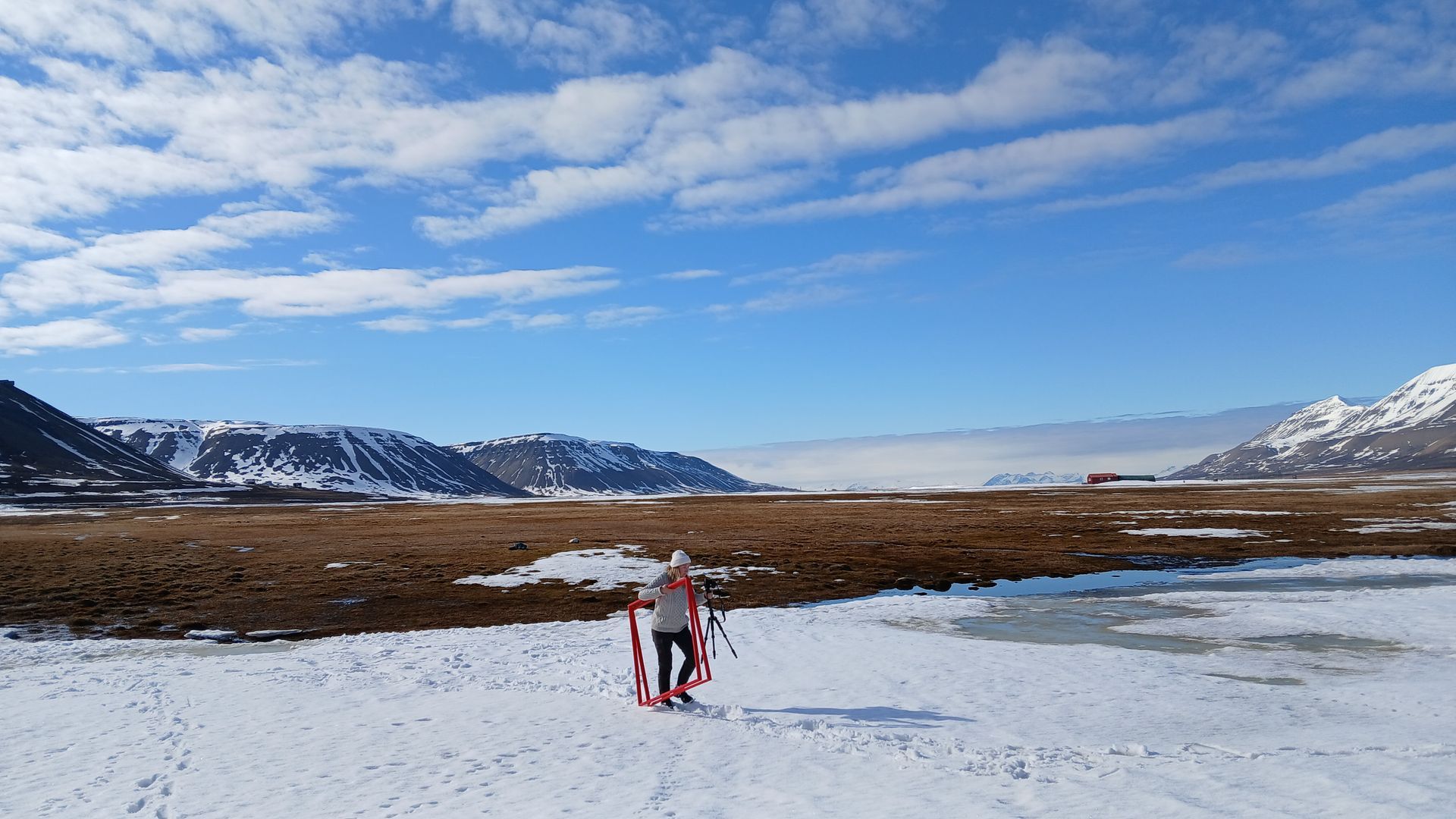 1 x 1 meter is the size of a frame used by scientists to research and determine the number of living organisms (fauna and flora). The frames were installed in 2007 in the Wadden Sea (photograph on the wall) and in 2025 in Adventdalen, Spitsbergen (image on the first monitor).